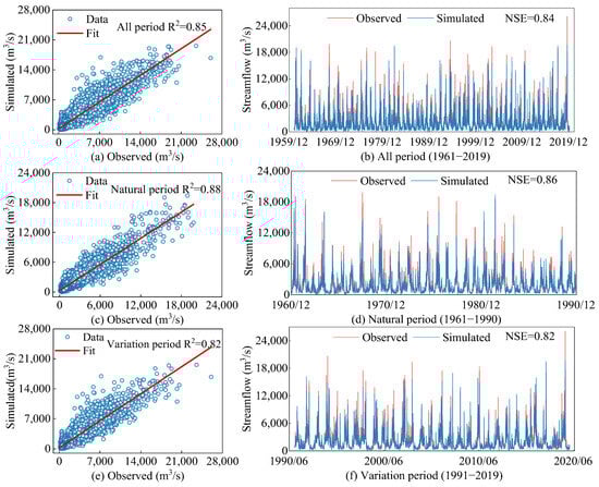 Ultimately, the main model parameters were set as shown in Table 2. The results of the meteorological streamflow model’s reconstructions for the XJR streamflow all follow these parameters. Figure 4 shows the overall effect of the streamflow reconstruction by the model. The observed and simulated streamflow series between 1961 and 2019 reached an R2 of 0.85 and an NSE of 0.84; in the natural period (1961–1990) and in the variation period (1991–2019), the R2 was 0.88 and 0.82, respectively, and the NSE was 0.86 and 0.82, respectively. These results indicate that the LSTM model performs well and can effectively capture the characteristics of streamflow variability.