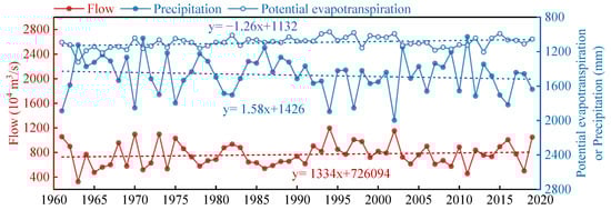 Changes in the inter-annual flow, precipitation, and potential evapotranspiration in the Xiangjiang River basin.