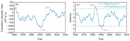 Sliding t-test is widely used in the analysis of hydrological time-series mutability. The method tests for mutation points by examining whether the difference between the means of the two sample groups is significant. For the time-series (x), there are a total of n sample sizes, with a certain moment as the reference point. The samples of the sequence x1 and x2 before and after the base point are n1 and n2, respectively, with mean and (in m3/s) and variance and (in m6/s2). Then, the statistics are as follows: