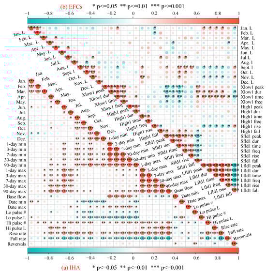 Correlation plots: (a) plot represents the correlation between the 32 IHA indicators and (b) represents the correlation between the 34 EFCs indicators; the specific values can be found in Appendix A. p represents the significant level.