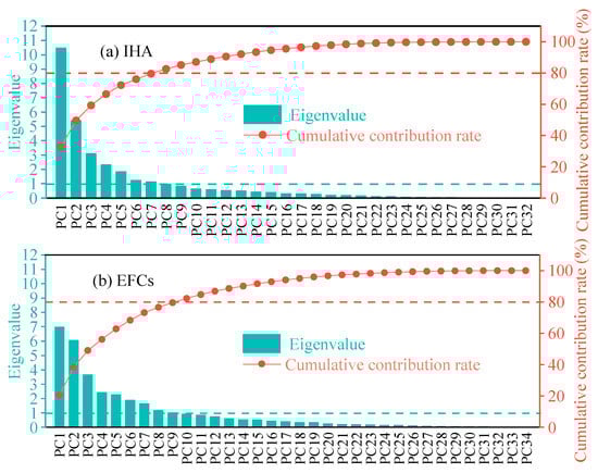 The correlation between the 32 IHAs and between the 34 EFCs was analysed based on the Pearson correlation coefficients. And, Figure 7 reflects the high sink residual and strong correlation between both indicators, like between the annual minimum flows (1, 3, 7, 30, and 90 day), between the time of occurrence and the number of major floods, etc. Thus, the ERHIs in this study were selected from the IHAs and the EFCs using PCA. Figure 8a,b show the eigenvalues and cumulative contributions of the IHA and the EFCs at Xiangtan Station, respectively. From Figure 8a, it can be observed that the eigenvalues of the first seven principal components of the IHA indicators for the XJR basin are all greater than one and have a cumulative contribution of about 80%. From Figure 8b, it can be found that the eigenvalues of the first nine principal components of the XJR basin’s EFCs indicators are all greater than one, and the cumulative contribution is about 80%. Based on the principle of principal component extraction, the PC1–PC7 in Figure 8a were selected as the main components of the required IHA indicators. And the PC1–PC9 in Figure 8b were selected as the main components of the required EFCs indicators in this study. In addition, a factor loading matrix of the principal components was calculated to further screen the ERHIs, with the criterion that the indicator with the highest or higher absolute value of the loading was used as the ERHIs. A month’s flow may be correlated to the previous month’s flow, but, as the 12-month average and low flows reflect the intra-year course of human and ecosystem water availability in a given month, we added these indicators to the ERHIs. The final screening of the ERHIs can be seen in Table 6.