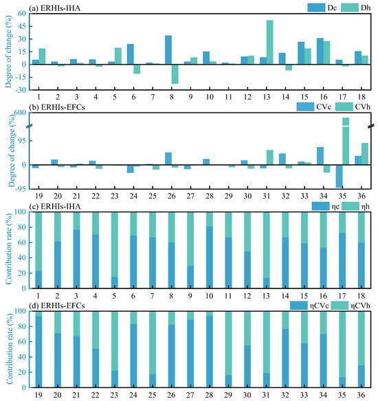 Impact of human disturbance and climatic factors on the ERHIs: (a,b) represent the degree of changes in the hydrological parameters (parameters 1–36, can refer to Table 6) driven by human activities and climate change; and (c,d) represent the contribution rates of human activities and climate change to changes in the hydrological parameters.