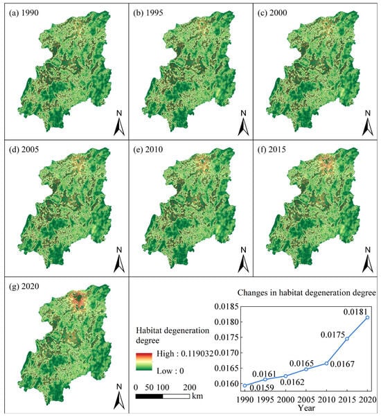 Distribution of habitat degeneration degree in the Xiangjiang River basin, 1990–2020.