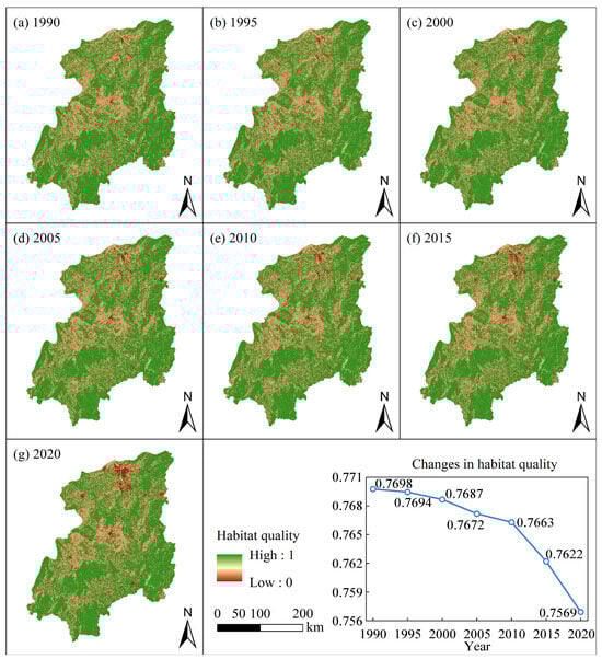 Spatial distribution of habitat quality in the Xiangjiang River basin, 1990–2020.