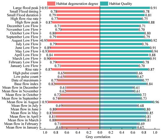 A grey correlation model was constructed from the time-series of habitat degeneration degree, habitat quality, and ERHIs in the XJR basin to quantitatively reveal the impact of hydrological changes on habitat quality (Figure 13). The habitat quality index had a strong correlation with each of the ERHIs (all the correlations were greater than 0.6). Of these, the ERHIs-EFCs were more highly correlated with the habitat’s quality (habitat degeneration degree) than the ERHIs-IHA, overall. For both the habitat quality and habitat degeneration degree, the ERHIs with correlations greater than 0.90 were mean flow in August, March low flow, May low flow, August low flow, and large flood peak. It is also clear from this that habitat quality (habitat degeneration degree) responds more strongly to changes in environmental flows.