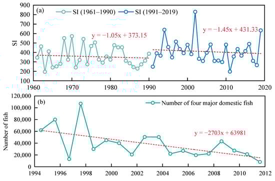 (a) Changes in the Shannon Index and (b) Situation of four major domestic fish in the Xiangjiang River.