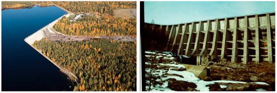 Photos of a typical Swedish buttress dam are presented in Figure 1. To permit thermal expansion and contraction, gravity and buttress dams are usually divided into distinct monoliths, the expansion joints being sealed using water stops. Shear keys are a common feature, but they are not universally applied. A stability analysis is performed for one monolith at a time without considering 3D effects. Three-dimensional analyses are commonly performed on arch dams and gravity dams with curved axes, but 3D effects have been observed in gravity dams with straight axes [,]. Analytical methods have also been developed for assessing the 3D effects on concrete gravity dams [,,]. Stability analyses of entire gravity dams, including their 3D behavior, have been performed using FE simulations [], but, to the authors’ knowledge, the 3D behavior of concrete buttress dams has not been examined.