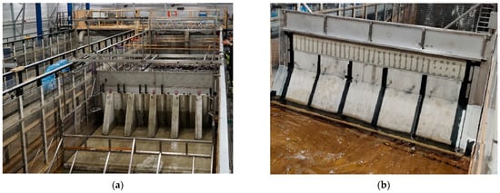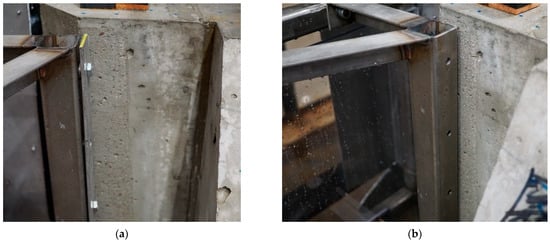 A prototype of a concrete buttress dam representative of several Swedish buttress dams in size, shape, and slenderness was constructed. The model monolith was created by scaling down the prototype by a factor of 1:15, resulting in a monolith that was 1.2 m high and 0.7 m wide; see Figure 2a. The front plate and the buttress wall had thicknesses of 140 mm and 200 mm, respectively. These thicknesses were slightly greater than desired but necessary to ensure a sufficient weight for stability reasons. Each monolith weighed ca. 570 kg. The concrete slab representing the rock foundation was 100 mm thick and cast with plywood formwork to create a smooth surface. The foundation slab measured 3.7 m in both length and width and was divided into three sections, with joints parallel to the stream direction.