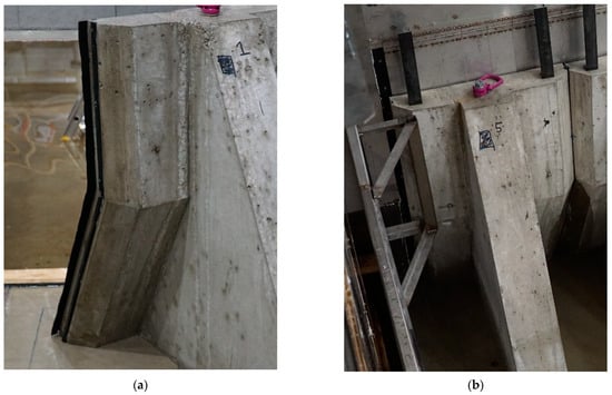In total, 42 tests were performed, but the results from 17 of the tests were discarded. That includes two tests of the pumps and watertightness of the model, two failed attempts for the overtopping tests, two failed overturning tests, and two failed tests due to wear on the model with high restraint (see Figure 5). The first three SM tests failed because the central monolith was not physically separated from the adjacent ones, and the results were omitted. Finally, six tests were performed with a single support. These did not result in the restraint assumed in the initial design of the tests. They instead resembled the tests with low restraint. They were, therefore, not considered in this study. However, the tests with one support were used to assess the applicability of digital image correlation (DIC) in the presented model tests []. This is presented further in Section 3.5.