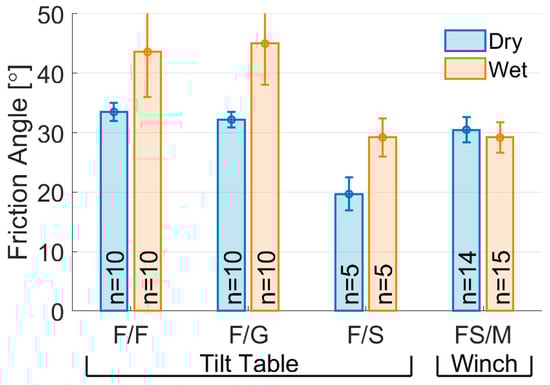 The friction at the interface between the model monoliths and the concrete slab was evaluated using the tilt table method proposed by Alejano et al. [], but the tests were performed with a manually operated tilt table, so a fixed tilt rate could not be used. Test blocks for the friction tests, measuring 150 × 150 mm2 and sawn to a height of 35 mm, were cast from the same concrete batch as the monoliths and the foundation slab. Since there was some leakage in the model, the interface between the monoliths and the foundation slab became saturated with water. For this reason, the friction tests were performed with both dry and wet blocks. The average friction from the tests is presented in Figure 6.