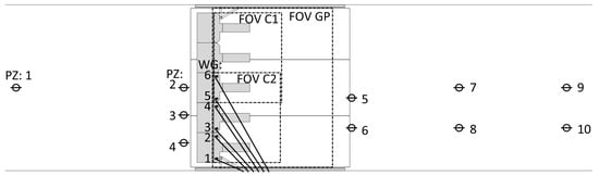 The instrumentation placement, including wire gauges (WGs), piezometers (PZs), and the field of view (FOV) of the top view cameras and video cameras. The numbers indicate the sensor number.