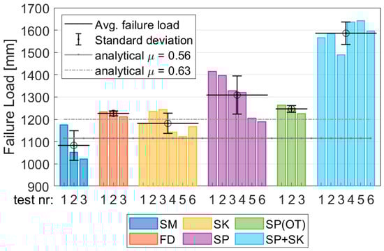 The failure loads in all the tests with a low degree of restraint were normalized to take wear into account. A linear regression analysis was carried out, with the test numbers in chronological order being used as the x-axis. Figure 13a shows the normalized failure load for the tests using a low degree of restraint. Tests with a single support (1S and 1S+SK) were included to increase the sample size. These tests gave a failure behavior similar to the models using a low degree of restraint (FD and SK) but are not presented in detail in this article (see Section 3.2). Figure 13b shows both the average failure load for all the test series and the adjusted averages. The failure loads () were normalized with respect to the adjusted SM test series. The adjusted averages suggest a comparable level of safety for the single monolith failure (SM) and the failure of the test series with low restraint (FD and SK). The figure shows that, with the original friction value of µ = 0.63, Equation (1) gave a good estimate of the load-bearing capacity for the single monolith (SM) and low restraint cases (FD and SK). With the adjusted averages, the load-bearing capacity increased by 13% in the case with moderate restraint (SP and SP(OT)) and 34% in the case with high restraint.