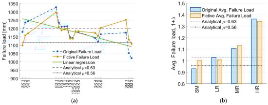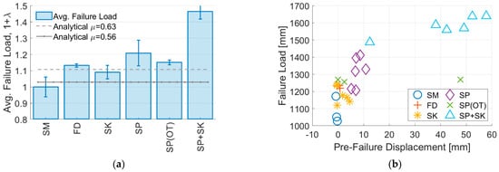 (a) Average failure load expressed according to Equation (3), normalized with respect to the average failure load in the SM case. The standard variation is indicated with error bars. (b) Failure load versus displacement at the point of failure.