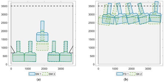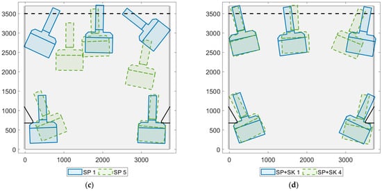 Top view of the final position of the monoliths for (a) a single monolith (SM), (b) a low degree of lateral restraint (FD and SK), (c) a moderate degree of lateral restraint (SP), and (d) a high degree of lateral restraint (SP+SK). The x- and y-axes are the distances from the lower left corner of the foundation slab in mm, and the dashed line is the protection rail. The individual test number is specified to highlight which test in the series is presented.
