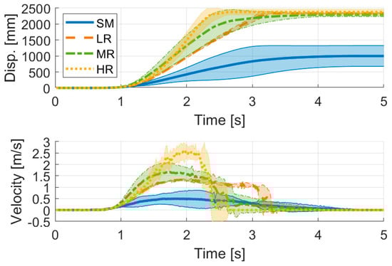 Average displacements and velocities during failures in the respective test series. The colored area shows the standard deviation (). SM: single monolith, LR: low restraint (average of FD and SK), MR: moderate restraint (average of SP and SP(OT)), and HR: high restraint (SP+SK).