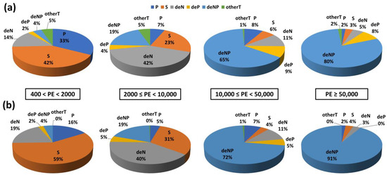 Water line treatments of Lombardy WWTPs: (a) 2019; (b) 2022. P: primary treatment; S: secondary treatment; deN: specific treatments for nitrogen; deP: specific treatments for phosphorus; deNP: specific treatments for nitrogen and phosphorus; otherT: other treatments not specified.