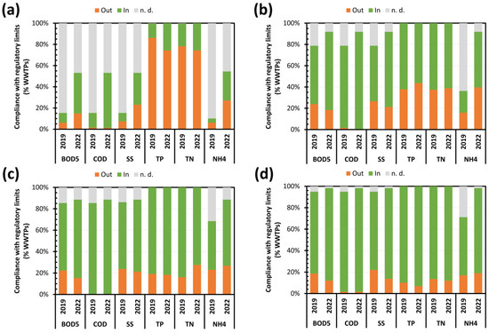 Compliance with the legislative requirements for direct reuse referring to the effluents of Lombardy WWTPs in the years 2019 and 2022. European and Italian requirements [9,41]: BOD5 ≤ 10 mg L−1; COD ≤ 100 mg L−1; SS ≤ 10 mg L−1; TP ≤ 2 mg L−1; TN ≤ 15 mg L−1; and NH4 ≤ 2 mg L−1. (a) 400 < PE < 2000; (b) 2000 ≤ PE < 10,000; (c) 10,000 ≤ PE < 50,000; (d) PE ≥ 50,000. In: regulatory limit respected; Out: regulatory limit not respected; n.d.: no data.