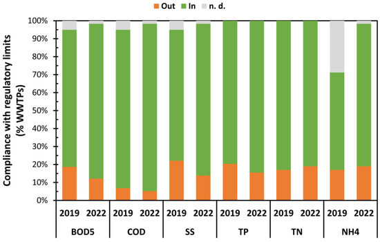 Compliance with the legislative requirements of the Lombardy region for direct reuse referring to the effluents of Lombardy WWTPs of ≥50,000 PE in the years 2019 and 2022. Lombardy requirements [42]: COD ≤ 60 mg L−1 for PE ≥ 50,000; TP ≤ 1 mg L−1 for PE ≥ 50,000; TN ≤ 10 mg L−1 for PE ≥ 100,000. In: regulatory limit respected; Out: regulatory limit not respected; n.d.: no data.