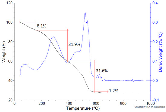 Thermogravimetric (black line) and weight derivative (blue line) curves obtained for the dried sludge.