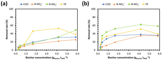 COD, N-NH4+, N-NO3−, and TP removal yields as a function of biochar concentration in treated WW. (a) Pyrolysis at 650 °C + chemical activation; (b) pyrolysis at 950 °C + chemical activation. COD: chemical oxygen demand; TP: total phosphorous.