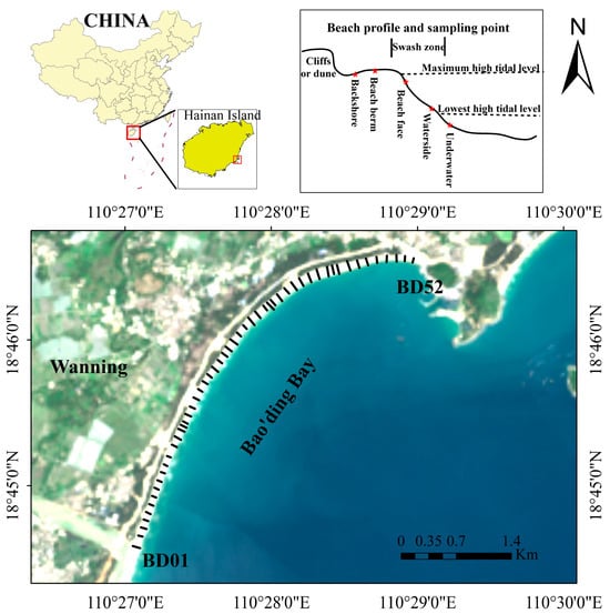 Bao’ding Bay (Figure 1), located in the east of Hainan Island in the South China Sea, is situated between 110.42°–110.45° E and 18.67°–18.73° N. Bao’ding Bay beach is a typical headland-bay beach with a promontory. Its straight section (exposed section) is fully developed. Under the cover of the headland at the northern end, the curved section (sheltered section) is also fully developed, and the headland-bay beach is in a dynamic equilibrium [38]. The beach morphology transitions from a dissipative state to a reflective state from north to south [39]. The study area is a wave-dominated microtide coast, with a mean tidal range of 0.92 m per year [40]. The waves are mainly composed of wind waves and swell waves, which account for 78% of the annual occurrence. The average wave height is 0.9 m, and the maximum is 5.2 m.
