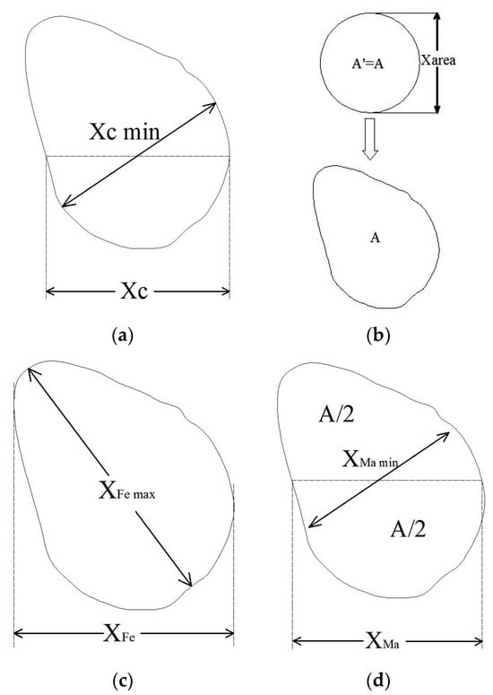 Camsizer-X2 (Microtrac Retsch GmbH, Düsseldorf Hahn, Germany) is a dynamic image analyzer that records the size and shape of grains using two linked cameras (a basic camera and a zoom camera) with a resolution of 0.8 μm, covering a measuring range from 8 μm to 8 mm. This instrument uses dual digital cameras (CCD) imaging technology, including a basic camera (CAM-B) to record the size and morphology information of the larger grains, and a zoom camera (CAM-Z) to record the fine ones [46]. These two cameras can either work together or separately to produce consistent data results for a wide range of grain sizes. The main calculation results include the maximum chord, XC, perpendicular to the measurement direction, the area equivalent circle diameter of the particle projection (Xarea), the distance between two tangents perpendicular to the measurement direction (Feret diameter XFe, with the maximum value as XFemax), and the diameter length through the center of the area in the measurement direction (Martin diameter XMa) (Figure 2). The smallest value of all maximum chords of the grain projection is XCmin, which is close to the sieve results [47].