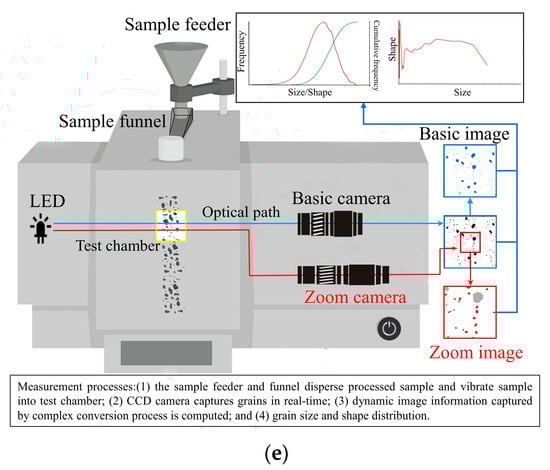 Different grain size definitions and the dynamic image method test illustrated via a schematic diagram: (a) maximum chord diameter, (b) equal area circle diameter, (c) Feret diameter, (d) Martin diameter, and (e) DIA.