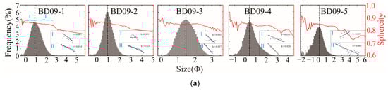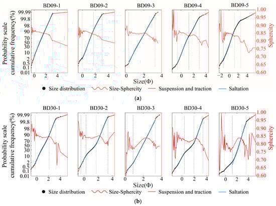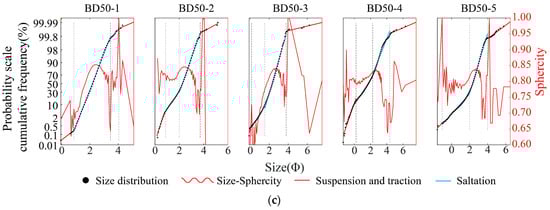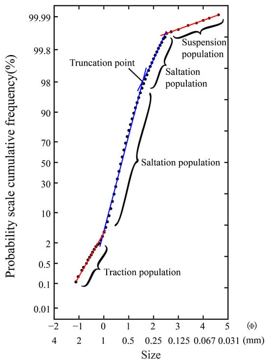 Visher [14] analyzed the deposition process and environment using the shape of the grain size cumulative frequency curve. This method is based on different log-normal sub-populations corresponding to different sediment transport modes (suspension, saltation, and traction) (Figure 3). Generally, sediment grain size distribution does not conform to a simple normal distribution but consists of several log-normal sub-populations. Each subpopulation has a different mean and standard deviation. Sediments can be divided into the three sub-populations of traction, saltation, and suspension due to their different transport forms. The grain size distribution of each transport mode is a log-normal distribution that differs from other transport modes with its own average grain size and sorting degrees. Therefore, in the probability coordinate system, each sub-population will form a separate line, with different slopes indicating different sorting degrees. The abrasion strength and mechanism of grains with different sizes and transport modes are also produced differently via the varying collision energies between grains [25,26]. At the same time, different transport distances and times lead to different sorting and abrasion processes of sediments during their transport and sediment processes [53,54]. Therefore, the grain size–shape curve trend characteristics provide information on sediment grain sorting and the abrasion process. This study compared the grain size cumulative frequency distribution curves with the grain size–shape trend curves to better understand the deposition process and sediment environments, provide a foundation for the truncation points, and improve accuracy.