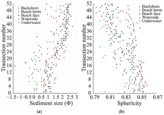 The sediment grain size and sphericity distributions along the Bao’ding Bay beach: (a) grain size; (b) sphericity.