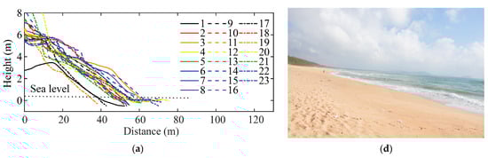 The beach profile and field pictures of the Bao’ding Bay: (a) reflective, (b) intermediate, (c) dissipative, and (d–f) filed pictures.