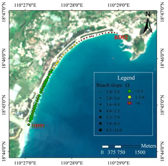 where D is the median grain size (mm), m is the beach slope, and T is degree Celsius. Temperature (T) is a parameter that affects the fluid kinematic viscosity coefficient and, thus, the sedimentation velocity of the sediment. Depending on the value of Ω, the beach can be dissipative (Ω > 6), reflective (Ω < 1.5), or intermediate (1.5 < Ω < 6). [45].