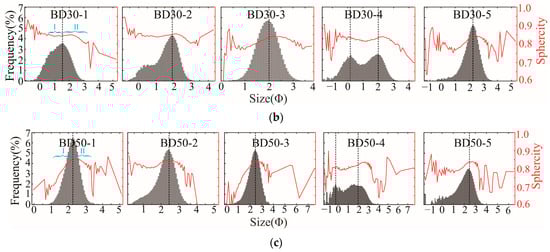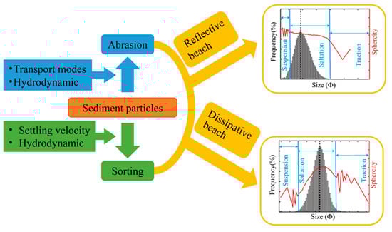 Sediment sorting encompasses both grain size and grain shape, with the components of appropriate size and large grain shape value often being preferentially selected and deposited during transportation. The grain size and shape of preferentially sorted particles exhibit distinct properties in various beach morphodynamic states. During their transportation, grains settle and accumulate at different grain sizes under different hydrodynamic conditions. Settling velocity is the dominant sorting parameter [59]. Settling velocity is higher for more spherical and regular grains [27,60]. The irregular grains have low setting velocities, and their falling path tends to deviate from the vertical descent to a spiral, inclined, circular, or another undefined path [60,61]. The sediment grain size component has the highest content, and the sphericity value of the grains in this component is also relatively high (Figure 8). For the reflective beaches, there is a large hydrodynamic force that allows for the sediment suspension and saltation population grains to move sufficiently. Gradually increasing the grain size and sphericity increases the settling velocity and facilitates deposition. However, for sediment particles in the saltation populations with too large a grain size (section I, Figure 8a), their grain sphericity is also large. They have higher settling velocities, resulting in a short transport distance that prevents them from reaching the beach.