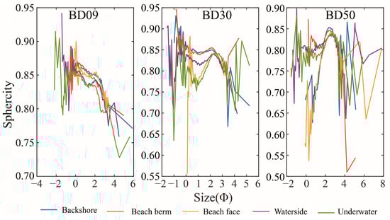 For the reflective beach sediments, the suspended population corresponded to smaller sphericity values, while the saltation population displayed an inverse relationship between grain size (Φ value) and sphericity; that is, larger grain sizes corresponded to larger sphericity values (Figure 7a). For the dissipative beach sediments, the sphericity values for the saltation populations first increased and then decreased with grain size (Figure 7c). For the intermediate beach sediments, the grain size–shape trend curve for the saltation populations exhibited two characteristics of both dissipative and reflective beaches; larger particles illustrated reflective beach characteristics, while smaller particles displayed dissipative beach characteristics (Figure 7b).