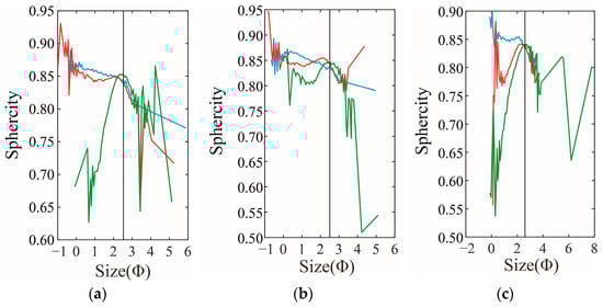 Sediment grain shape parameters include sphericity, aspect ratio, symmetry, and roundness. Sphericity is a typical shape characteristic that measures how spherical the grains are. The area and the circumference of each grain were calculated. The sphericity is given by the following formula (Equation (2)), where A is the area of a grain projection, and U is the circumference of a grain projection: