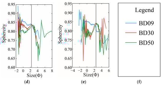 Figure 7 illustrates the relationship between the sediment grain size–shape trend curves and the log-normal sub-population identified via the grain size cumulative frequency curves. Due to the large number of sediment samples in this study, sediment samples with transects numbered 09, 40, and 50 (reflective, intermediate, and dissipative beaches, respectively) were selected for display here. The cumulative frequency curve of beach sediments can be divided into a range from three to five sub-populations; suspension populations are on the right, traction populations are on the left, and saltation populations are in the middle between them. The suspension and traction population proportions were far less than that of the saltation populations, which accounted for more than 90%. Overall, the grain size–shape trend curves match well with the suspension, saltation, and traction populations. The grain size–shape trend curves corresponding to the suspension and the traction population greatly fluctuated, while those corresponding to the saltation populations were smooth.