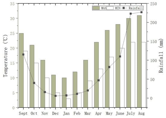 The studied river is located in Chengdu, Sichuan, southwest China. The average altitude of Chengdu is 750 m, and the temperature ranges from 2 to 31 °C (Figure 1). Based on the data of the Meteorological Bureau of Chengdu, to reflect the seasonality of river hydrology, the authors classified spring (from March to May), summer (from June to August), autumn (from September to November), and winter (from December to February), and the average season lasted approximately three months.