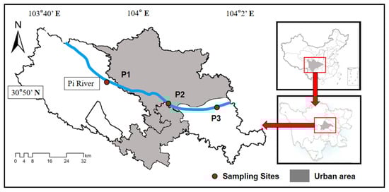 The water supply of the Chengdu area is mainly provided by the Minjiang River from Dujiangyan. The Pi River flows through the northern part of the main city of Chengdu, with an irrigated area of 1973.3 hm2 and an annual flow of approximately 26.4 m3 s−1. To reflect the spatial difference, we selected three representative sampling points in the upstream reach (P1), in the middle (P2), and in the downstream reach (P3) of the Pi River (Figure 2). P1 was far from the areas with intensive human activities, and human activities have little influence on the river environment. P2 was located in the central area of the city in an urban park surrounded by traffic arteries and distribution centers of the building materials industry. P3 was outside the main urban area of Chengdu, and the surrounding land use is mostly used for agricultural activities. The distance between the sampling points was 15–20 km, effectively highlighting the difference in spatial water quality.