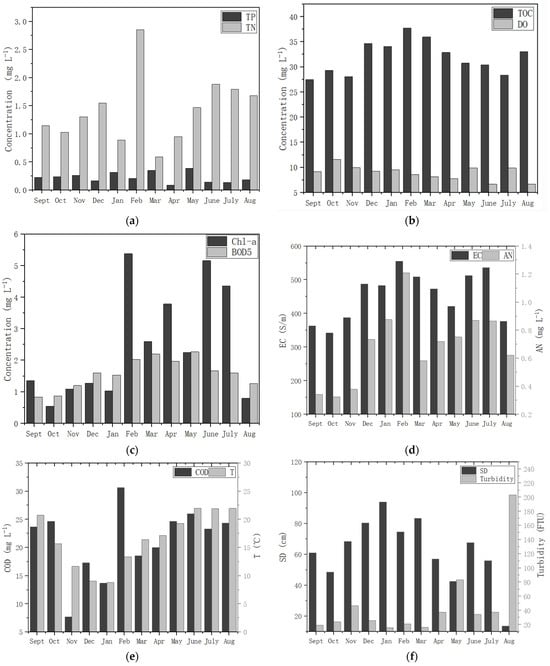 Variations in the water quality indicators in the Pi River: (a) concentrations of the TN and TP; (b) concentrations of DO and the TOC; (c) concentrations of Chl-a and the BOD5; (d) EC and AN; (e) the COD and T; (f) turbidity and the SD.