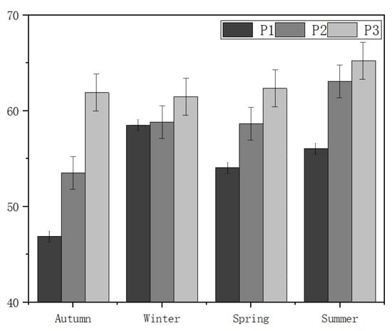 Based on Chl-a as the leading factor evaluation parameter, the TN, TP, COD and SD, which were significantly correlated with Chl-a, were selected to calculate the TLI (∑) eutrophication state index. The spatiotemporal changes in the eutrophication state index in the season of the Pi River were obtained, as shown in Figure 5. The TLI (∑) in P1 of the river was the lowest (mean 53.89), followed by P2 (mean 58.53). P3 was the highest (mean 62.76). The annual TLI values of the three sampling points were significantly different (p < 0.01). The TLI (∑) value peaked in summer (June to August) with a mean value of 61.46, revealing moderate eutrophication, while the values in the other three seasons were relatively stable with no significant difference. The river was, thus, classified as moderately eutrophic in summer and lightly eutrophic in the other seasons.