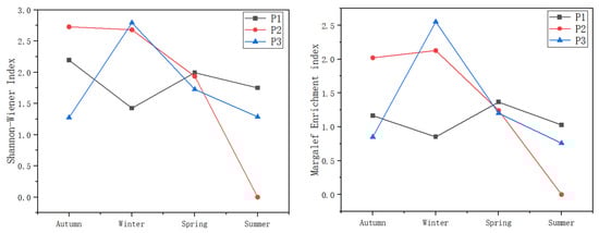 The spatiotemporal variations of the Shannon–Wiener index (H’; left) and Margalef’s Richness Index (dM; right) in the Pi River.