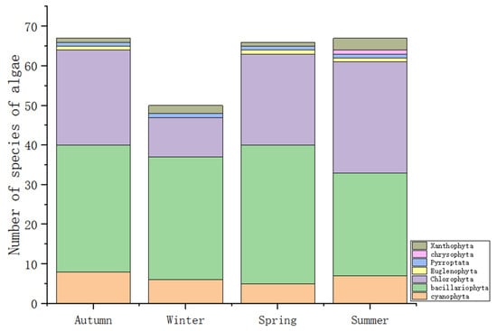 During the experiment, 130 species of phytoplankton from seven phyla were collected in the study river, including 15 species of Cyanophyta, 54 species of diatoms, 51 species of Chlorophyta, four species of Xanthophyta, four species of Euphyta, one species of dinoflagellates, and one species of Chrysophyta. Diatoms and Chlorophyta were the main species in the Pi River, accounting for 41.54% and 39.23% of all the algal species, respectively. Cyanobacteria accounted for 11.54%, Xanthophyta and Euglenophyta accounted for 3.08%, and dinoflagellates and Chrysophyta accounted for 0.77%. From the perspective of temporal change, the number of algae species in winter was the lowest in the whole year, especially Chlorophyta, which had only 10 species in winter (24 species in autumn, 23 species in spring, and 28 species in summer), which significantly differed from the other seasons (Figure 7). The number of algae species at various points in the Pi River varied widely, ranging from 14 to 49 species, with the highest value appearing at the downstream point in autumn and the lowest value appearing in the middle point in summer. The number of algal species in P1 was stable during the test, while the number in P2 fluctuated greatly. The annual average value was significantly lower in P2 than in P1 and P3. The number of algal species in P3 were relatively low in winter and stable in other seasons, with an average value of 37 species.