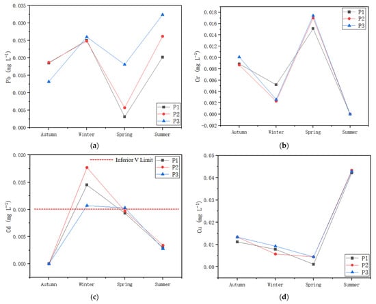 This study detected and analyzed eight kinds of metals in the water and sediment of the Pi River (Table 8; Table 9). Cd in the water exceeded the class V water limit, which indicated that the water body was seriously polluted by Cd (0.0165 mg L−1) in winter, and heavy metals in the water were relatively stable. The spatiotemporal variation in heavy metals in the water is shown in Figure 8.