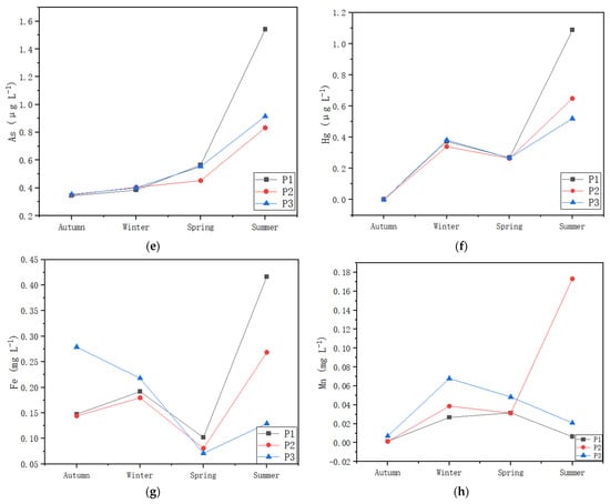 Changes in the heavy metal contents in water. (a) Contents of Pb; (b) contents of Cr; (c) contents of Cd; (d) contents of Cu; (e) contents of As; (f) concentrations of Hg; (g) contents of Fe; and (h) contents of Mn.
