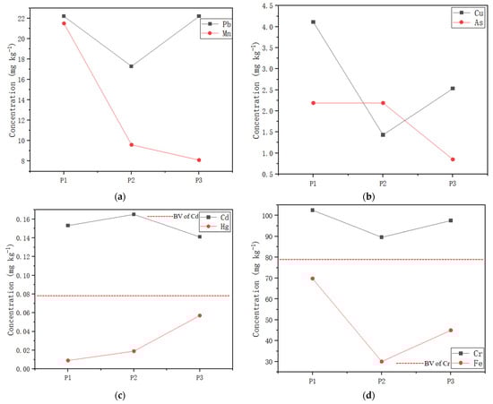 Changes in the heavy metal contents in sediment: (a) contents of Pb and Mn; (b) contents of Cu and As; (c) contents of Cd and Hg; and (d) contents of Cr and Fe.