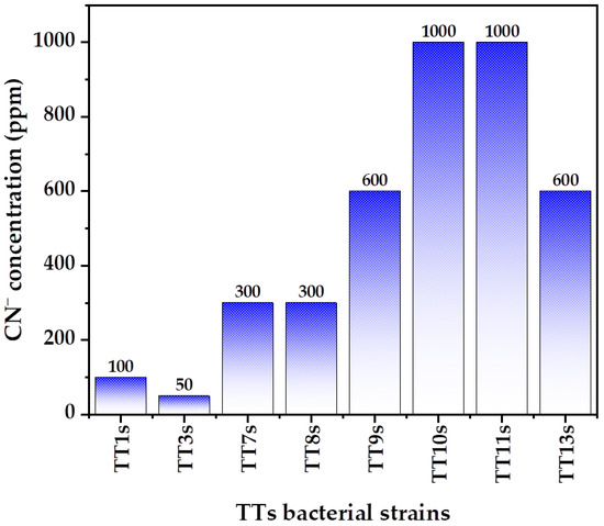 Cyanide is a highly toxic compound to living organisms that is used in various economic activities, mainly related to mining [73,74]. These mineral extraction activities generate wastes contaminated with heavy metals or toxic substances like CN that disperse into the environment [13,75]. This study isolated eight bacterial strains from a soil sample with sulfur mining residues that could tolerate 50–1000 ppm CN under alkaline conditions (Figure 1). Strain TT10s was identified as Bacillus subtilis and chosen for further study due to its exceptional ability to withstand and degrade high cyanide concentrations under alkaline conditions compared to prior B. subtilis strains and its rapid growth rate.