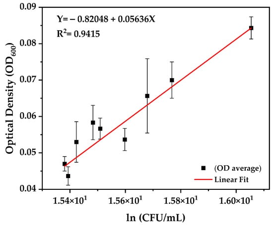 The relation between the OD optical density and the natural logarithm of the bacterial growth in CFU/mL of the TT10s bacterium was determined by means of a linear adjustment of its growth curve (Figure 2), determining an R2 of 0.94 for the TT10s bacterium. Although this method may interfere with the results, due to the detection of non-cellular solids in the samples, it is advantageous due to its speed and automation [60]. For this reason, this calibration curve was made with replicas to estimate the bacterial growth of live cells in the biodegradation process of the TT10s bacterium.