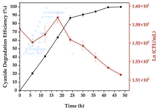 The biodegradation study of free cyanide was carried out via sampling every 6 h for the bacterial strain TT10s, as it was the strain with the greatest viability capacity at concentrations up to 1000 ppm in the M9 mineral medium at a pH of 10.5, temperature of 35 °C, and 0.2 vvm. This TT10s bacterial strain presented a degradation of 1000 ppm cyanide in less than 48 h (Table 3), with a degradation efficiency of up to 100% at 48 h and a maximum bacterial growth of up to 1.583 × 101 (ln CFU/mL) at 18 h (Figure 3).