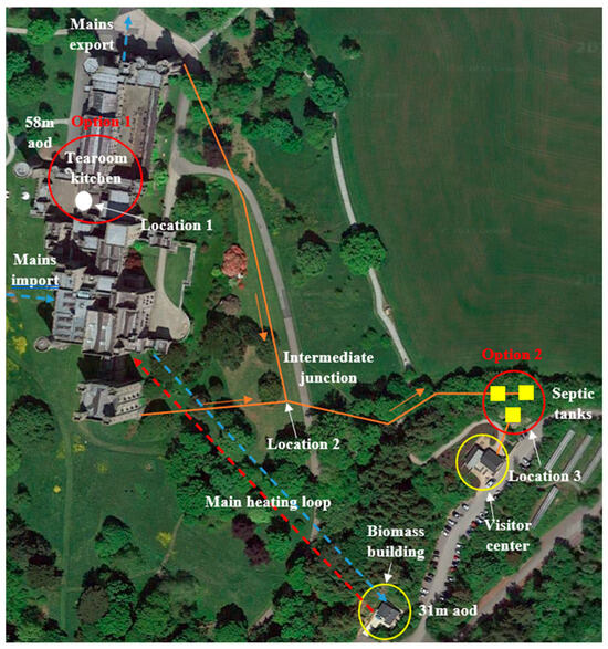 The current primary heating system is located in a biomass building (plant room), 250 m away from the Castle and at an elevation of about 30 m lower than the Castle (see Figure 1). Reducing heat consumption at the Castle would result in less biomass consumption and also reduced pumping costs for the main heating loop. The property is currently heated by two woodchip-based biomass boilers of 150 kW each (total 300 kW), represented as the traditional heating system in Figure A2 in Appendix A. The heat produced by the boilers is collected by a primary heating loop. The heat is then delivered to the secondary loop, also denoted as the main heating loop, by a plate heat exchanger. This is represented by the dashed lines in Figure 1 from the biomass building to the technical room local to the tearoom kitchen.
