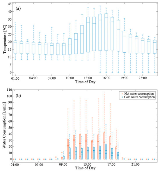 The monitoring of drain water temperatures at the kitchen drain resulted in temperatures up to 58 °C, with median values ranging from 22–38 °C and an average daily flow of around 650 L (see Figure 2). The hot and cold water consumption within the kitchen was collected in order to account for drain water flow. This data was also used by Spriet et al. (2019) to generate synthetic load profiles for daily variations in wastewater flows and temperatures [8]. This was potentially an ideal location for heat recycling as the discharge point was in very close proximity to the heating interface unit (HIU) between the biomass boiler and the main castle heating loop (a 2–3 m distance). Therefore, recycled heat could be more easily integrated into the existing heating system at this point.