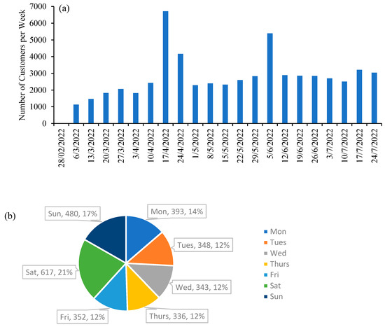 (a) Weekly variation in tourist visit numbers to Penrhyn Castle (b) Breakdown of the average daily visits within a week throughout the period 1 March 2022–24 July 2022.